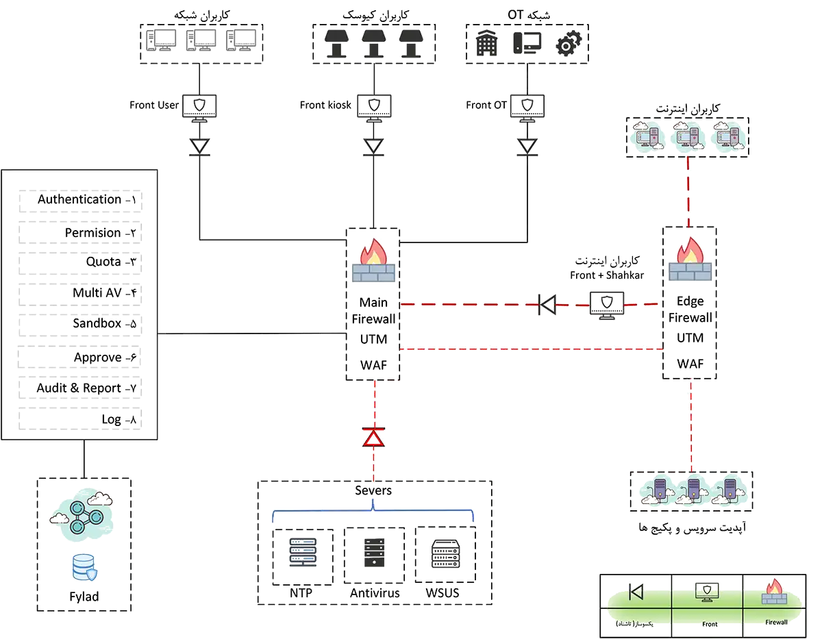 برای هر شبکه یک فرانت مستقل تعریف میشود و ارتباط با هسته مرکزی فقط از کانال Airgap یکطرفه انجام میگیرد.