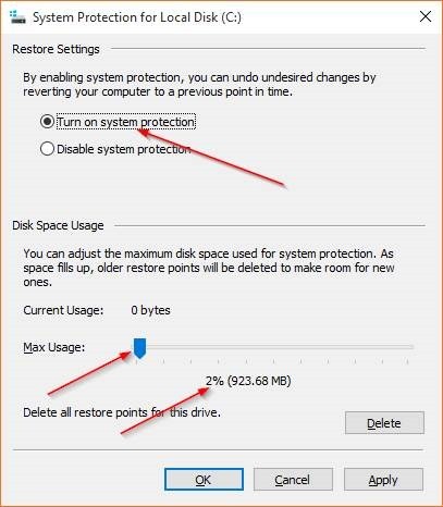 نکته: Max Usage حداکثر فضای اختصاص داده شده از هارد دیسک به Restore Point است.